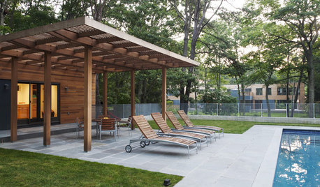 A pergola made from western red cedar shelters visitors poolside at this New York retreat