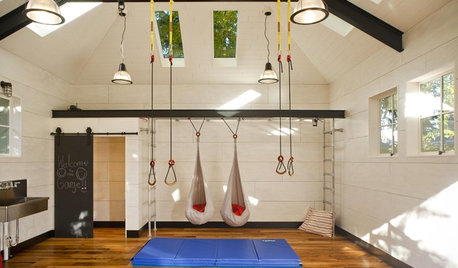 An active Washington state family encourages creative and athletic play by transforming a garage into a multipurpose gym-style pavilion