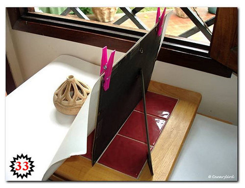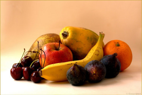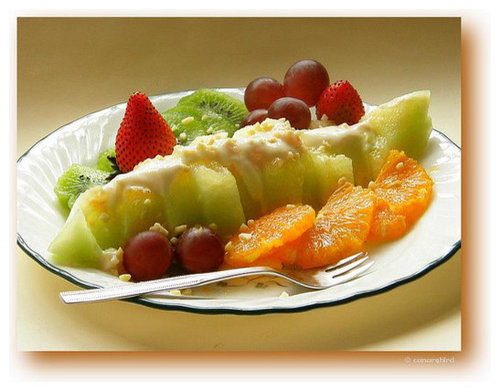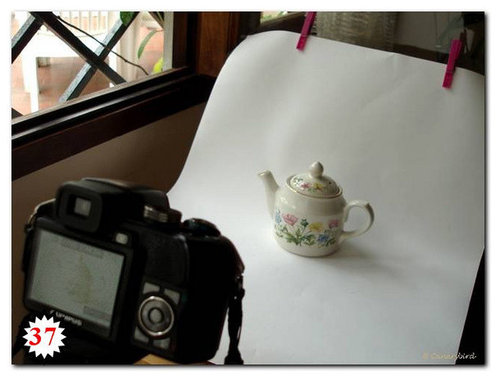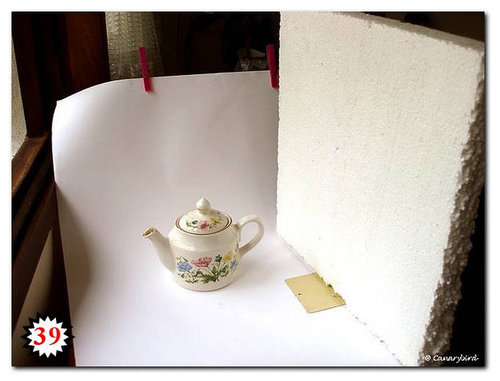 Comments (0)Posted by canarybird (My Page) on Wed, Aug 12, 09 at 11:45 Food Photo Tips: Part 6 - Making a Mini Light Box Hi again everyone. I'm back with another entry on how to use your digital camera for taking tabletop photos. This time I'm going to show how to make a miniature version of a light box, which can be useful for photographing small objects. I'm also working on making a full sized box out of a cardboard printer box which will be used for photographing larger objects, including plates and dishes of food. Mini box (left) Full size box under construction (right) But it might be easier to practise with a mini box to test your results and your skills with a box cutter or sharp scissors. If you have a handy teenager, (or other person clever with crafts and model building, who won't cut off a finger with the box cutter) you may enlist some help with this although it takes less than an hour to make, requires no special skills and doesn't have to be good looking. The idea of a light box is to create a partially enclosed 'white room', with white walls, a white sweep (that paper background we made previously in Part 4 - Seamless Backgrounds), with cutout windows and ceiling covered with white paper, into which we project a strong overhead light and usually a light on either side aimed at the white paper windows so that any object introduced into the box will be bathed in total white light with no shadows. You will have often seen pictures on the web of an object which seems to float on a pure white background. Eg: Cook's Thesaurus. This effect can be achieved in a light box. And it's quite entertaining to see what you can produce from this setup. These last two pictures were taken with my 15 watt CFL desk lamp overhead and one 7 watt CFL spot lamp (that green one) at the left window. Even better would be a 2nd spot pointing at the right window. (I need to go out and buy that 2nd spot lamp...they cost about $12 here so not an expensive item and good for the mini box.) Construction of the Mini Box: Materials needed: small box of sturdy cardboard, box cutter or small sharp scissors, ruler or metal straight edge, pen, glue stick, white paper (I always seem to use printer paper.) I used a small box measuring 5.25 x 7 inches (13.5 x 18 cm) that contained a little desk lamp. You can use a larger box as well of course, but your lights will have to be accordingly more powerful. And I think it's better that you keep it as a vertical box, higher than wider, so that the lid opening will be your ceiling. We can still make the bigger box later once we have caught the idea of how best to create the whitest environment. On my little box I took off the top flaps of the lid and using a box cutter, cut out windows on the sides, leaving a frame of cardboard about 1 inch (2.5 cm) all around, except for the bottom edge of the front 'door' which I cut off. Then I took white printer paper and after cutting it to the size of one side (5.25 x 7 inches/ 13.5 x 18 cm) glued it with a glue stick into the INSIDE of a window side, then repeated that on the inside of the window facing it. Glue carefully and smooth out any wrinkles, which would show up in your photos. To further cover the edges, cut out strips of white paper to size and overlap the newly installed white paper to the back wall and the floor, smoothing carefully so the edges are well stuck down and wrinkle free. Do this on both window sides. Cut a paper sweep to go inside your box, but DON"T GLUE it in, just slide it in so it is removable when it becomes spotted . The measurements should be....width a little smaller than the width of your box. In my example, with a 5.25 inch (13.5 cm) box width, my paper sweep was perfect at 1/4 inch less than the box width...that is at 5 inches wide (11.5 cm). Length of the sweep:....start with a piece of paper a little shorter than the box height plus the box depth (from back wall to front door) and slip it into place until it reaches the edges of the door, as in the photo below. Check that you have a nice curve in the sweep, that it reaches the 'front door' and trim off any excess that sticks up over the top at the back. The finished box should look something like this. Many light boxes also use a thin sheet of paper...often white tissue paper or white tracing paper over the 'roof' of the box and this will give you a soft diffused light. If you are going to photograph any reflective item of metal, ceramic or glass you won't want a reflection of the light bulb in the top lamp showing on your object, so you should then use a thin white material or paper to soften the white glare. If you have a good strong light on both top and sides you will be okay with the diffusor on top as the light will be sufficient. If the light is too strong, then move the lamps away a little from the box. Some examples with fruit: First a sideview of the setup and one example of creating a very soft photo using Exposure Compensation (EV +1.3)... that's 4 clicks up from 0.0... to give deliberate over exposure. Here I was able to get photos using just the overhead desk lamp. If you don't have extra lamps (they must all have the same type of bulb...tungsten or CFL, not mixed) see how you can do with the overhead lamp close to the top opening of your box and raising the EV value to make the picture lighter. This you can do while looking through the viewfinder before taking the photo. A little less raising of the Exposure Compensation, that is.... pushing it up 3 clicks (instead of 4) to EV +1.0, makes the image a little less over exposed and more defined (left photo). With no EV changes to the picture, you would have a normal exposure, as in the second photo. Now you know how to make misty white photos if you wish to have that effect. When you raise the EV value using the plus+, you are actually decreasing the shutter speed of your camera, so it stays open longer, lets in more light and gives you a more exposed (lighter) image. Conversely, when 