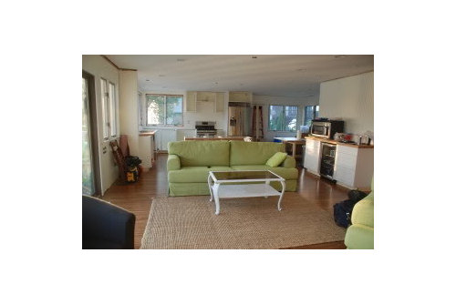 Vaulted ceilings, windows galore and a simple white palette make for casual indoor-outdoor living