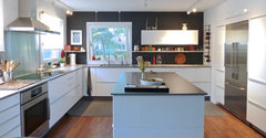 Teal cabinetry and display shelves for collections give an L.A. designer’s kitchen lots of visual appeal