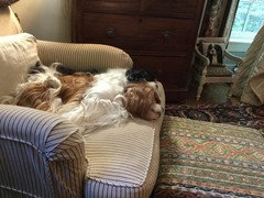 Here are Roman and Shimmer having their “before dinner” nap. That‘s opposed to the late afternoon or after dinner naps! Roman was next to me in my chair for the late afternoon portion - got too warm and left to join his sister. Cavaliers are groupies - they love the company of another dog. I’ve had as many as 5 at one time. I think 2 is the perfect number, and I like an “unmatched” pair - one tricolor and one Blenheim. Sweetest dogs on earth...