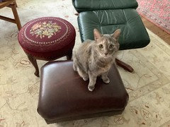 The green leather on the top right goes with DH’s Danish recliner (we won a gift certificate in a raffle to the store, we never could have afforded it otherwise!) It has a slope that makes it very comfortable.The brown leather in front goes with our leather sofa and upholstered chairs. It’s very comfortable, too, as the cat demonstrates. (She has honored you with your presence, she was very intrigued with the idea of 3 ottomans together! And she much prefers using the 3rd one for scratching grrr...)